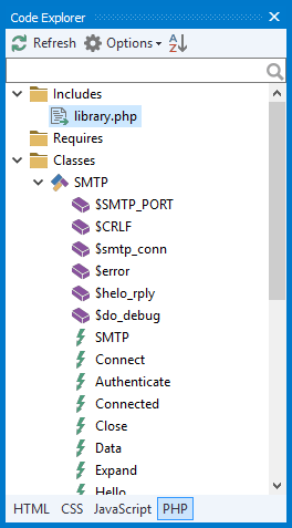 Code-Explorer führt die im Script enthaltenen Klassen, Funktionen, Variablen und Includes auf und ermöglicht es Ihnen somit, schnell die jeweilige Stelle aufzurufen. Klicken Sie einfach auf das angezeigte Element.
