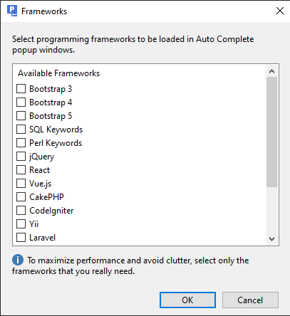 Erhöhen Sie Ihre Produktivität dank der Unterstützung beliebter Programmier-Frameworks wie jQuery für JavaScript und Prado, CodeIgniter, Yii und Symfony für PHP. Frameworks werden in Auto-Vervollständigen und im Sprachen-Browser unterstützt. Lassen Sie es uns wissen, sollte Ihnen eine bestimmte Bibliothek fehlen.