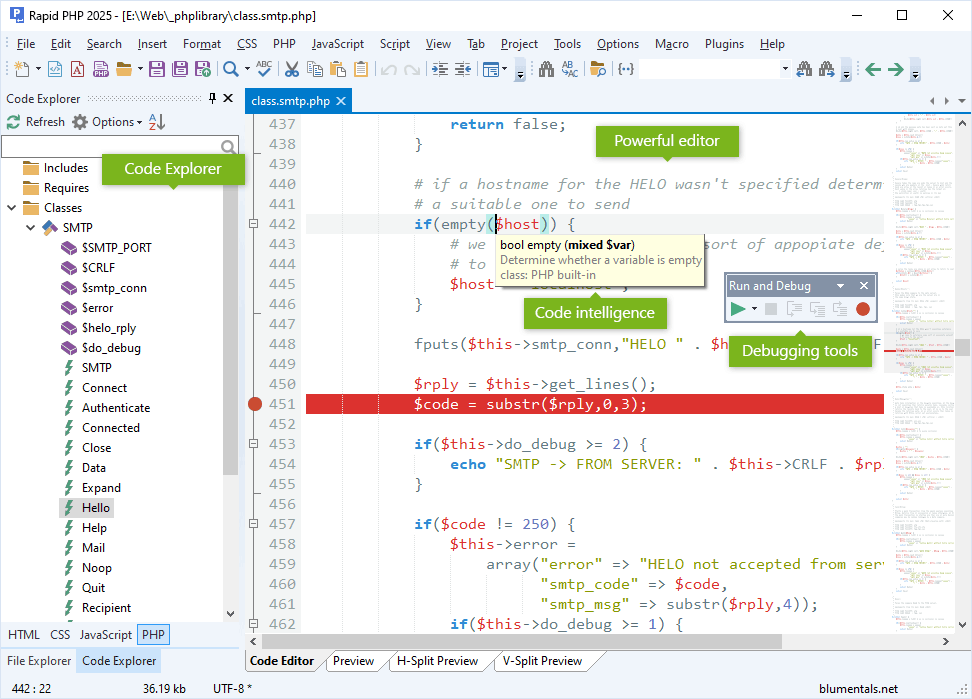 Rapid PHP ist ein kompletter PHP-Editor mit allen wichtigen Funktionen wie Auto-Vervollständigen, Funktions-Tipps und integrierter Dokumentation.