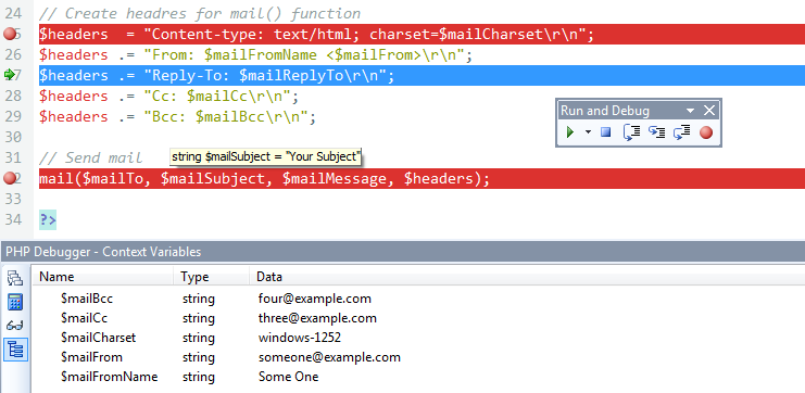 PHP debugger allows you to view Context Variables and Call Stack, Evaluate expresisons and maintain Watches.