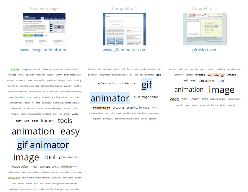 The keyword density charts vizualize the keyword density situation between your page and your competitors.